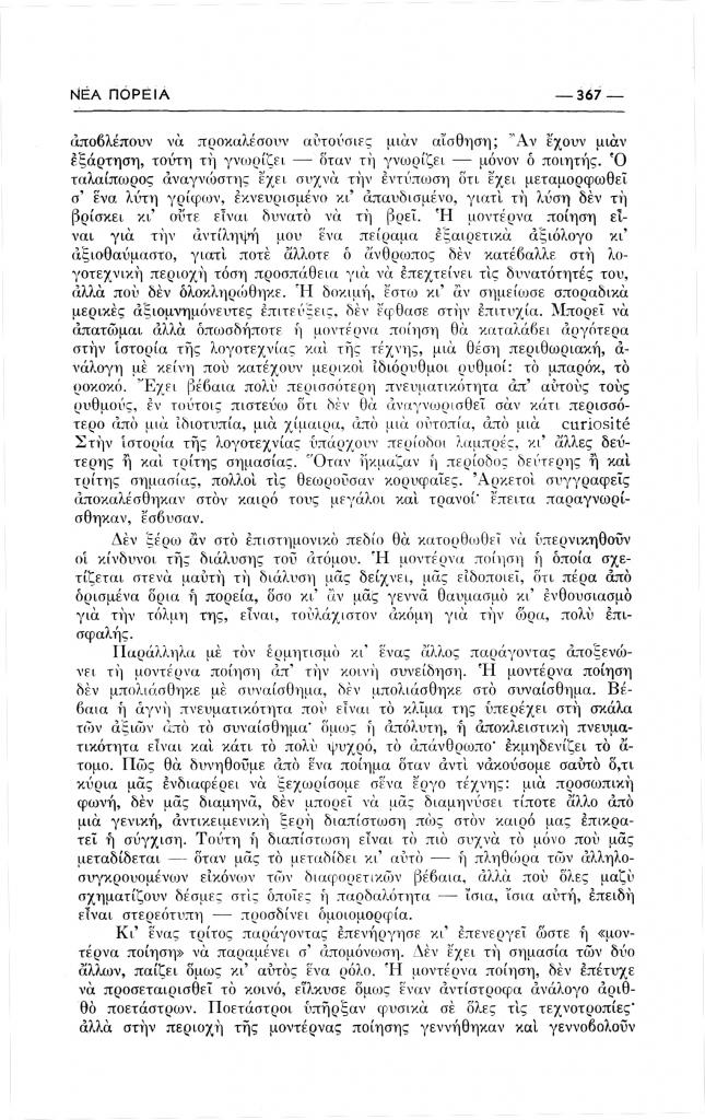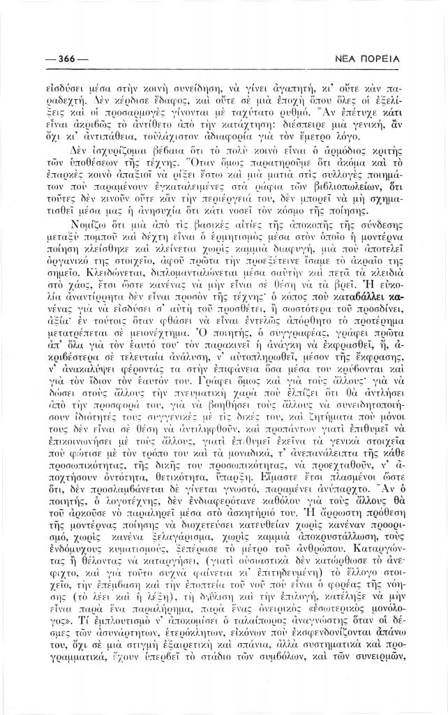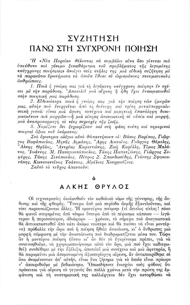 Θρύλος Άλκης, «Συζήτηση πάνω στη σύγχρονη ποίηση», Νέα Πορεία, τόμ. 1, τχ. 9-10 (Νοέμβριος-Δεκέμβριος 1955), σ. 365-377
