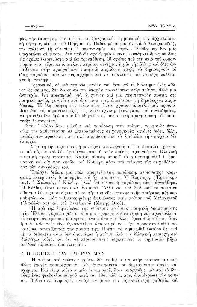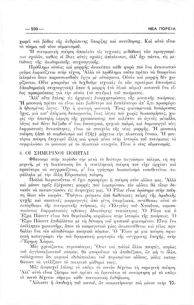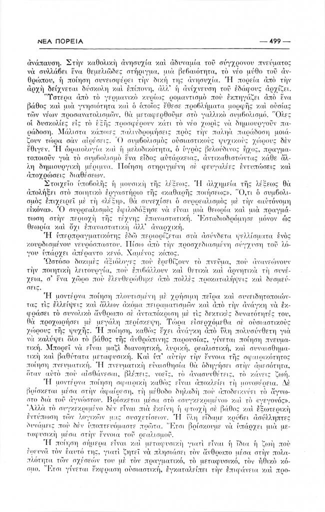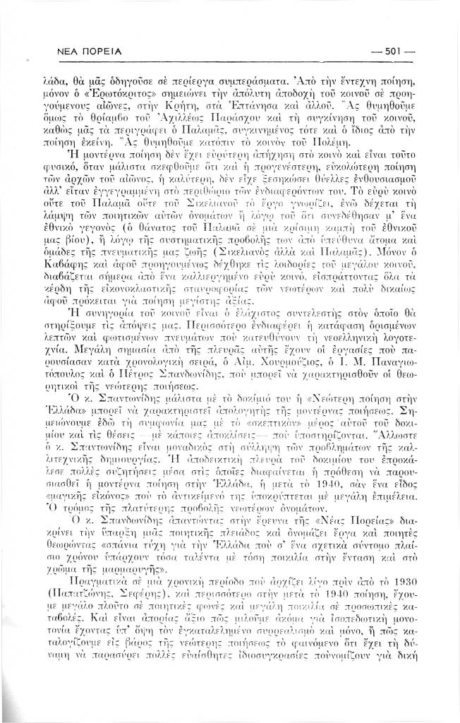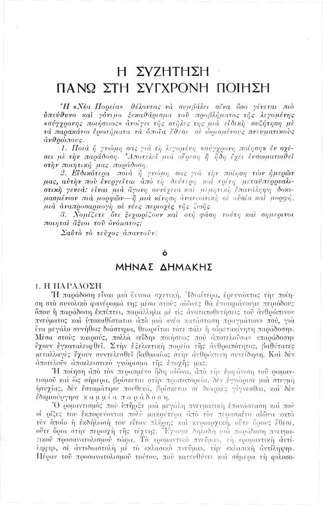Δημάκης Μηνάς, «Η συζήτηση πάνω στη σύγχρονη ποίηση», Νέα Πορεία, τόμ. 2, τχ. 13 (Μάρτιος 1956), σ. 497-502