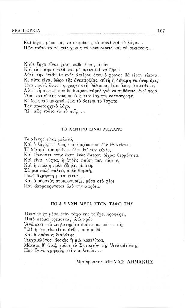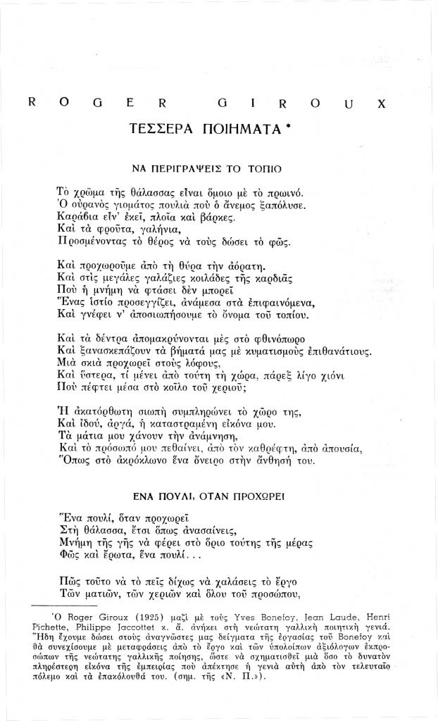 Giroux Roger, «Ένα πουλί, όταν προχωρεί», Νέα Πορεία, τόμ. 4, τχ. 40 (Ιούνιος 1958), σ. 166-167