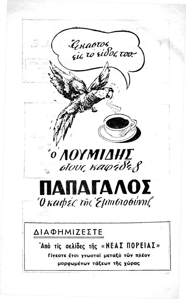 «Καφές Λουμίδης», Νέα Πορεία, τόμ. 4, τχ. 41-42 (Ιούλιος-Αύγουστος 1958), σ. 260