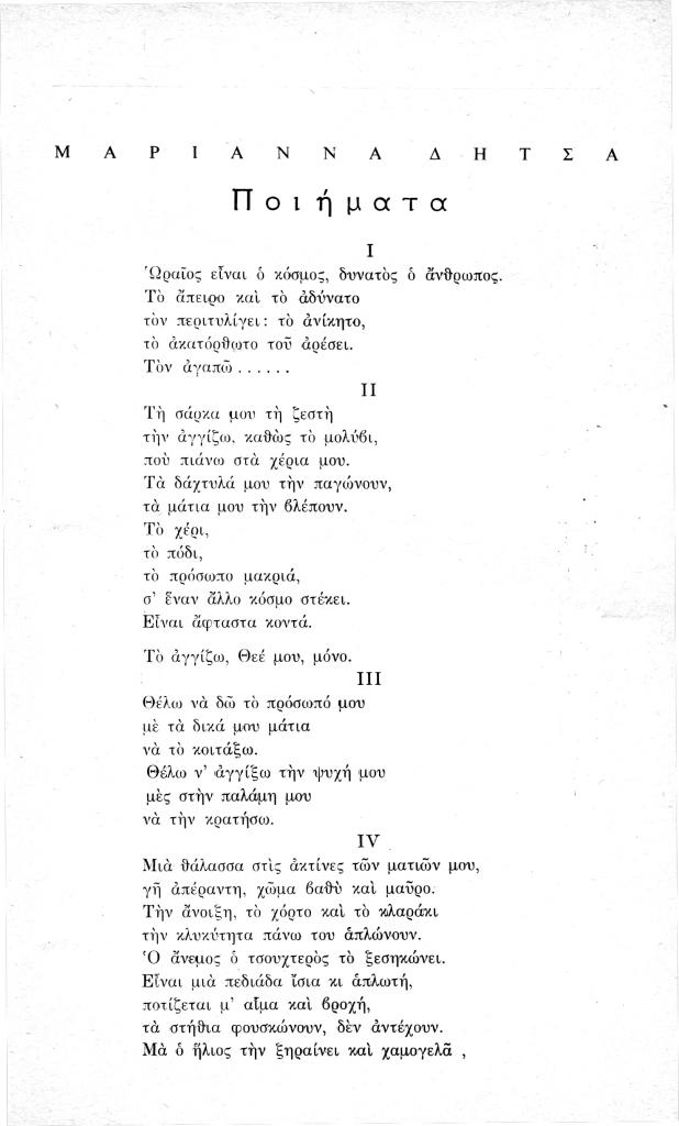 Δήτσα Μαριάννα, «Ποιήματα [I-VII]», Νέα Πορεία, τόμ. 7, τχ. 73-74 (Μάρτιος-Απρίλιος 1961), σ. 125-127