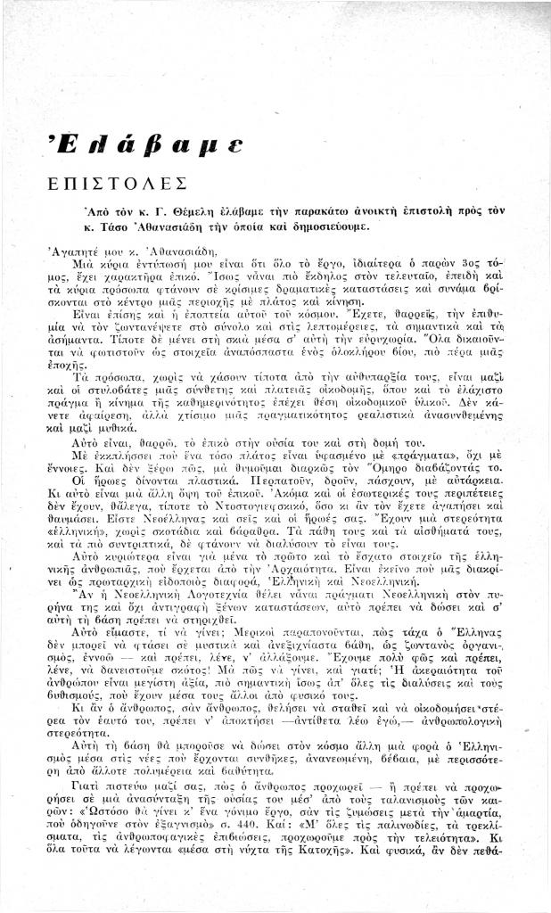 Θέμελης Γιώργος, «[Επιστολή]», Νέα Πορεία, τόμ. 7, τχ. 77-78 (Ιούλιος-Αύγουστος 1961), σ. 285-286