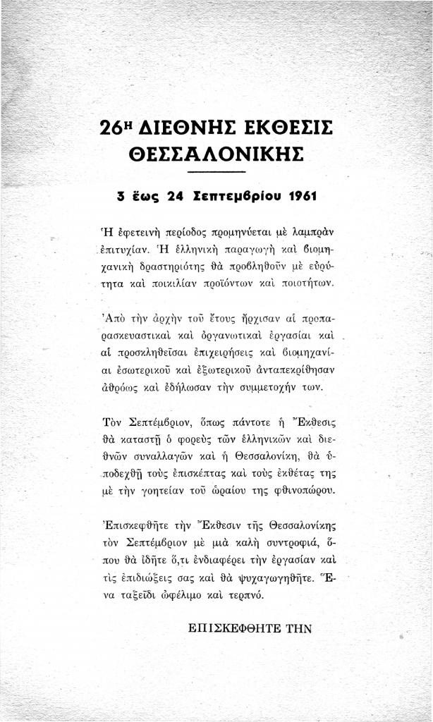 «26η Διεθνής Έκθεση Θεσσαλονίκης», Νέα Πορεία, τόμ. 7, τχ. 79 (Σεπτέμβριος 1961), σ. (έσω οπισθόφυλλο)