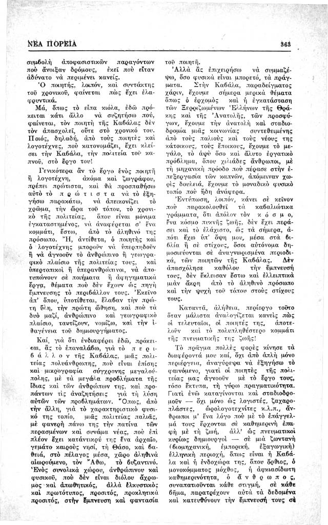Πρασίνης Φώτης, «Περιθώριο. Η ποίηση στην Καβάλα (ή το χρέος του ποιητή σε μια πολιτεία)», Νέα Πορεία, τόμ. 9, τχ. 104-106 (Οκτώβριος-Δεκέμβριος 1963), σ. 362-364