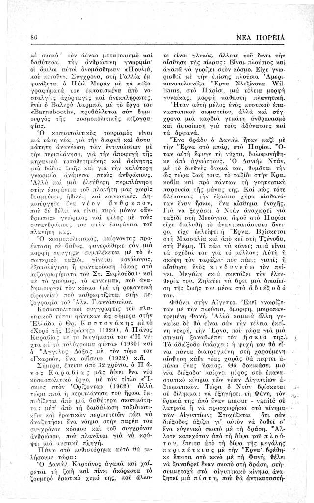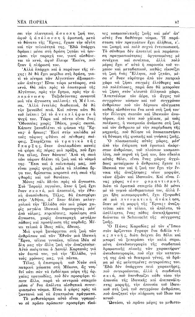 Σπανδωνίδης Πέτρος Σ., «Πάνου Καραβία, Ίσκιος στον ορίζοντα, μυθιστόρημα», Νέα Πορεία, τόμ. 9, τχ. 97 (Μάρτιος 1963), σ. 85-88