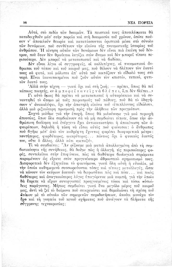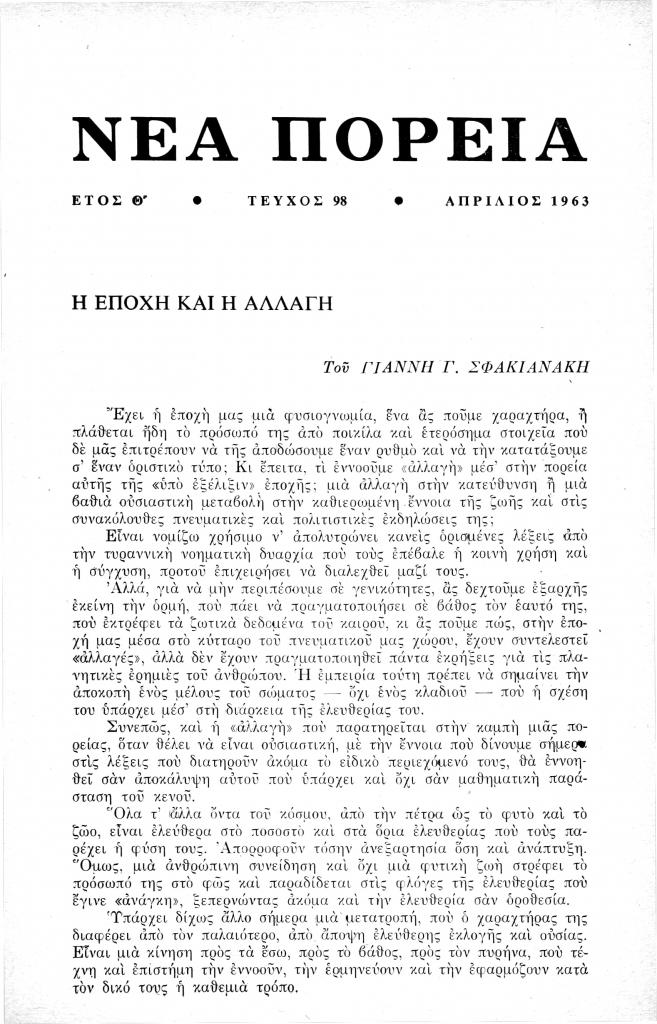 Σφακιανάκης Γιάννης Γ., «Η εποχή και η αλλαγή», Νέα Πορεία, τόμ. 9, τχ. 98 (Απρίλιος 1963), σ. 97-98