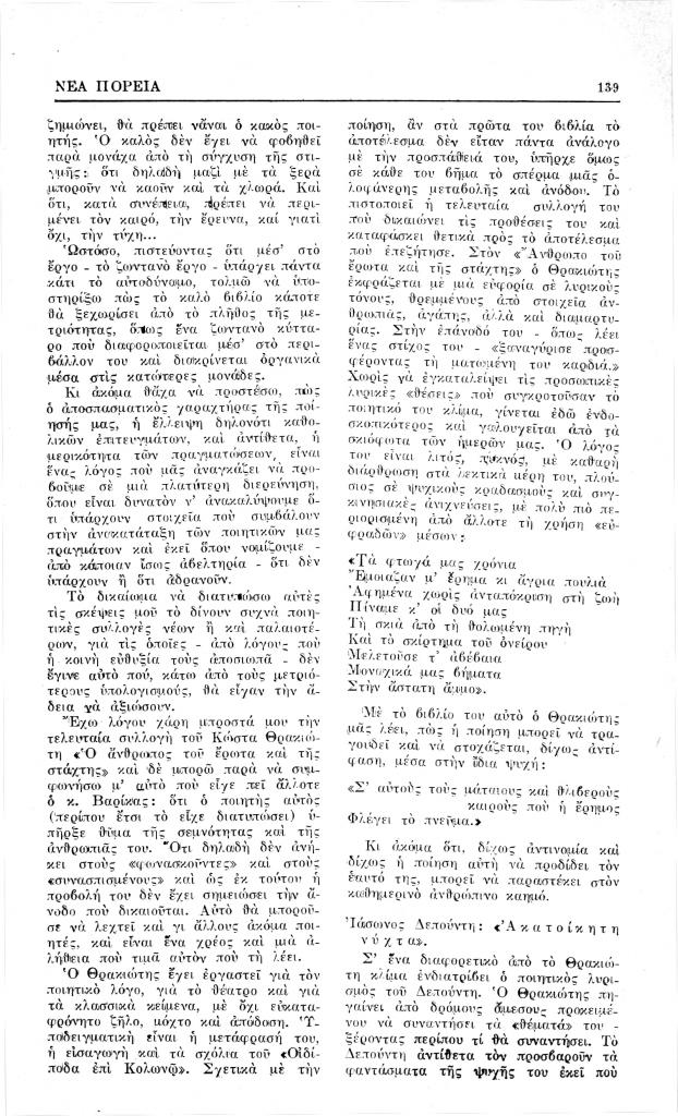 Σφακιανάκης Γιάννης Γ., «Κώστα Θρακιώτη, Ο άνθρωπος του έρωτα και της στάχτης», Νέα Πορεία, τόμ. 10, τχ. 109-110 (Μάρτιος-Απρίλιος 1964), σ. 138-139