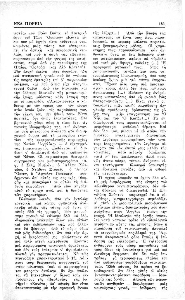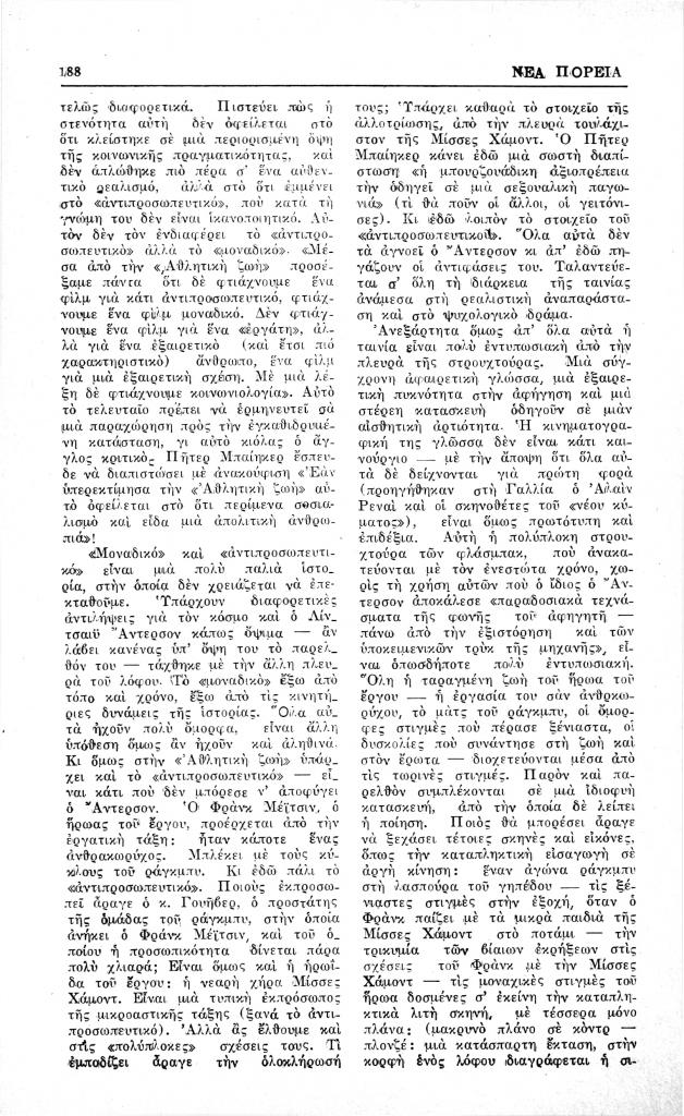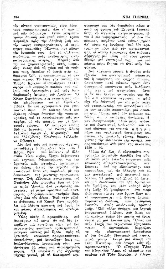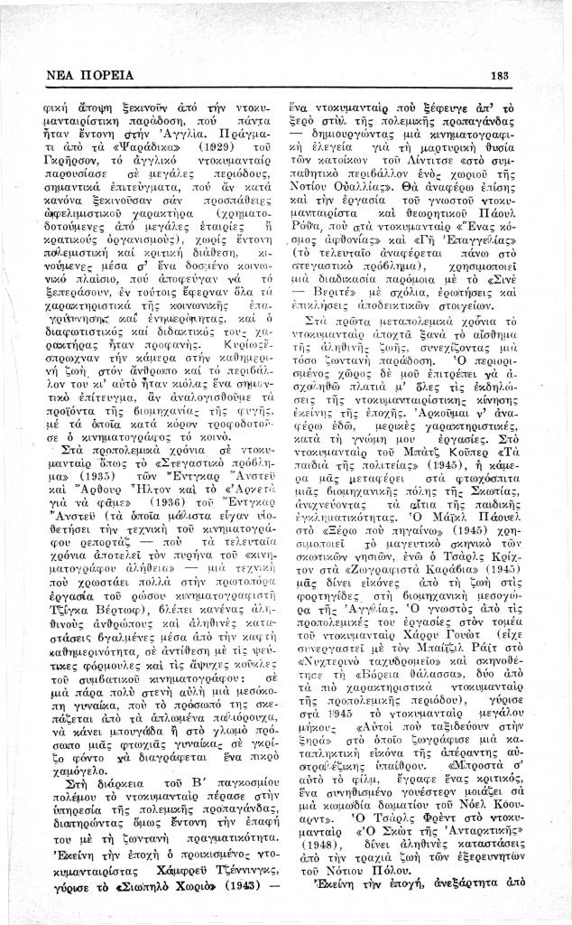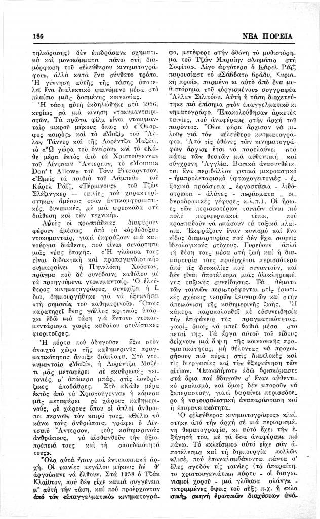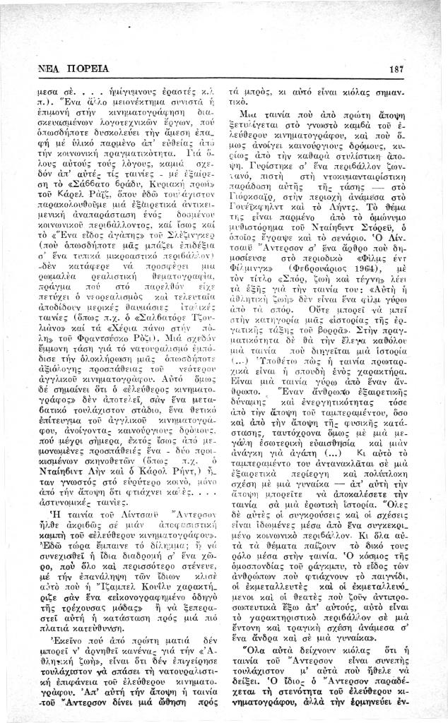 , «Ο κινηματογράφος. Αυτή η αθλητική ζωή του Λίντσαιυ Άντερσον και η παράδοση του αγγλικού ντοκυμανταίρ», Νέα Πορεία, τόμ. 10, τχ. 111-112 (Μάιος-Ιούνιος 1964), σ. 182-189