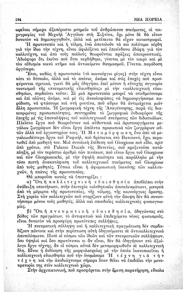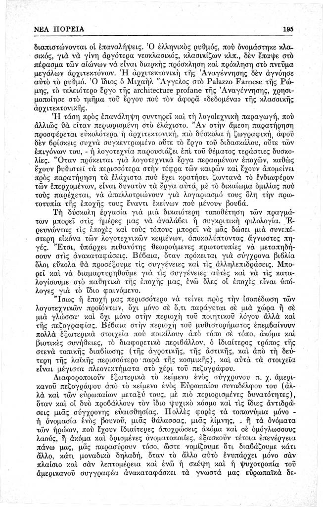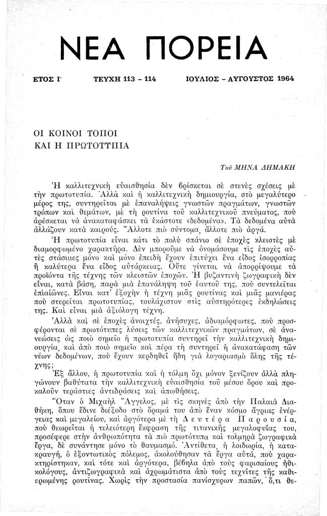 Δημάκης Μηνάς, «Οι κοινοί τόποι και η πρωτοτυπία», Νέα Πορεία, τόμ. 10, τχ. 113-114 (Ιούλιος-Αύγουστος 1964), σ. 193-197
