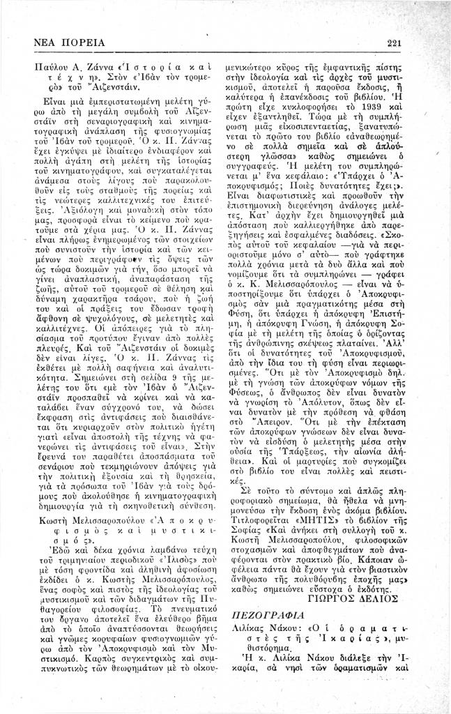 , «Παύλου Α. Ζάννα, Ιστορία και τέχνη στον Ιβάν τον τρομερό του Αϊζενστάιν», Νέα Πορεία, τόμ. 10, τχ. 113-114 (Ιούλιος-Αύγουστος 1964), σ. 221