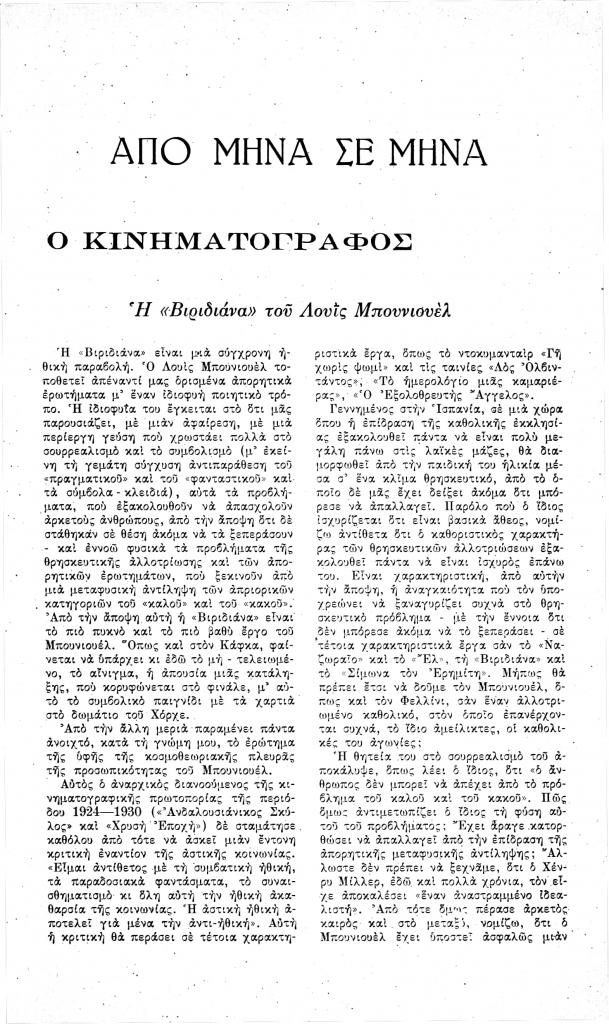 , «Ο κινηματογράφος. Η Βιριδιάνα του Λουίς Μπουνιουέλ», Νέα Πορεία, τόμ. 11, τχ. 129-130 (Νοέμβριος-Δεκέμβριος 1965), σ. 281-282