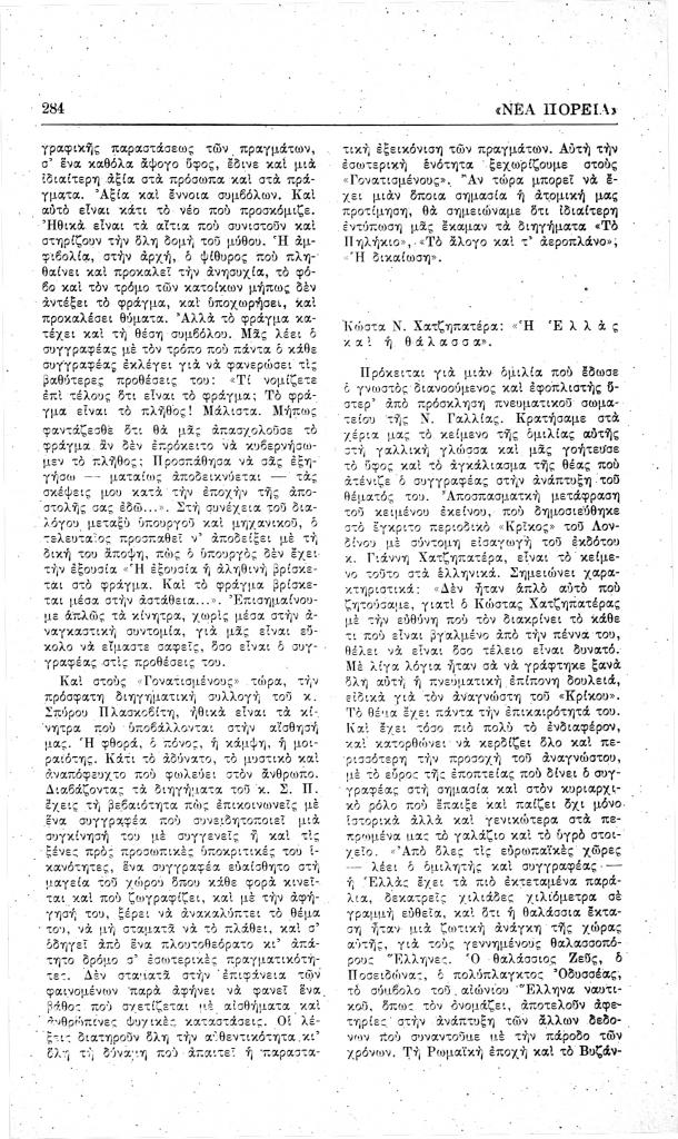 Δέλιος Γιώργος, «Κώστα Ν. Χατζηπατέρα, Η Ελλάς και η θάλασσα», Νέα Πορεία, τόμ. 11, τχ. 129-130 (Νοέμβριος-Δεκέμβριος 1965), σ. 284-285