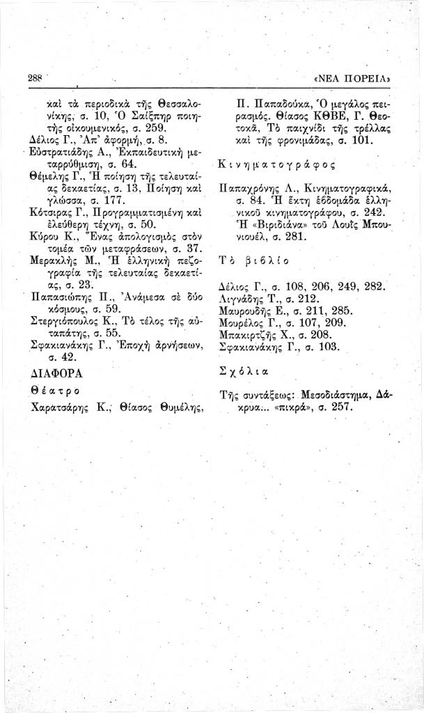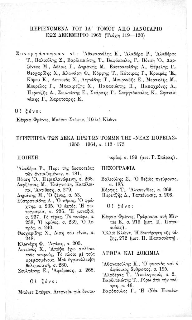 «Περιεχόμενα ΙΑ΄ τόμου (1965)», Νέα Πορεία, τόμ. 11, τχ. 129-130 (Νοέμβριος-Δεκέμβριος 1965), σ. 287-288