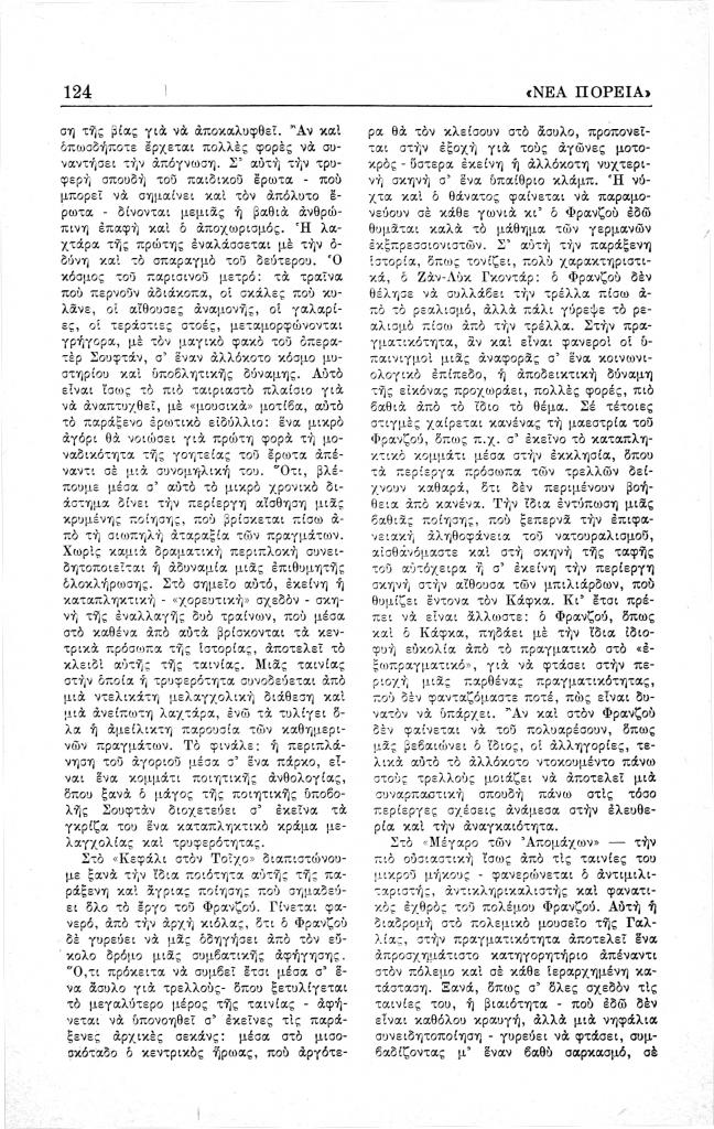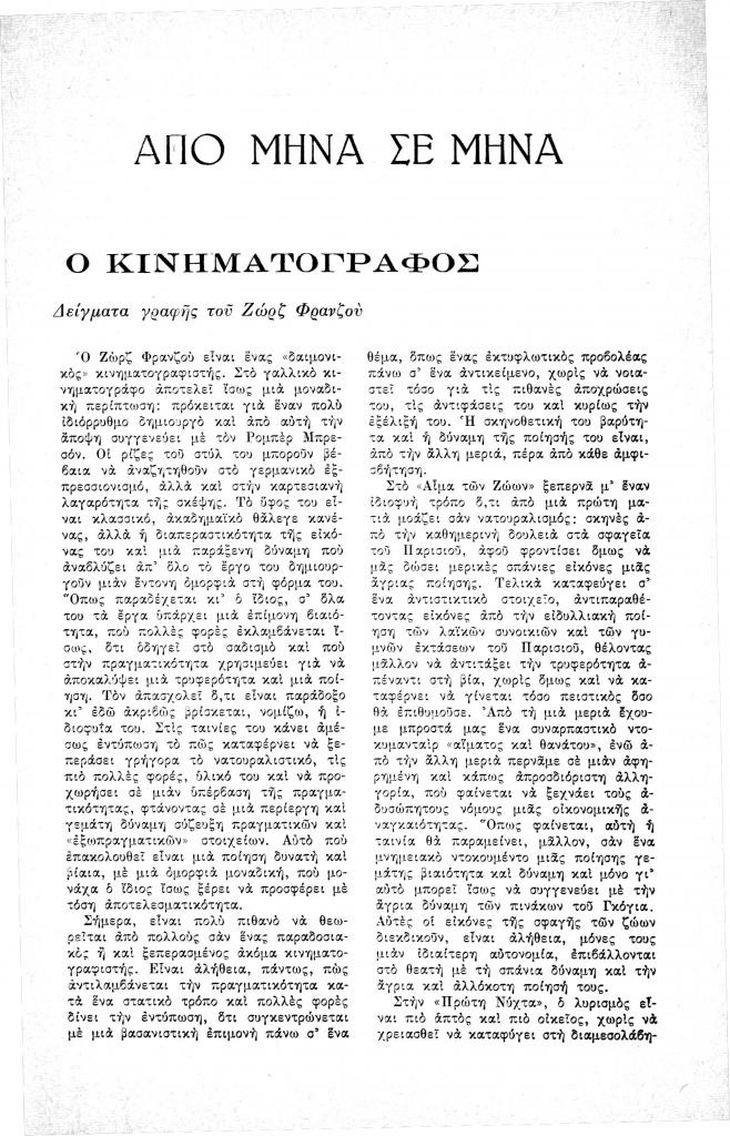 Παπαχρόνης Λάμπρος, «Ο κινηματογράφος. Δείγματα γραφής του Ζωρζ Φρανζού», Νέα Πορεία, τόμ. 12, τχ. 134-135 (Απρίλιος-Μάιος 1966), σ. 123-125