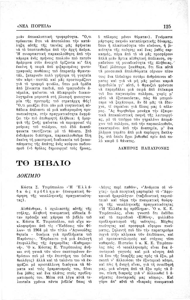 , «Κώστα Σ. Τσιρόπουλου, Η Ελλάδα ως πρόβλημα (πνευματική θεώρηση της νεοελληνικής πραγματικότητας», Νέα Πορεία, τόμ. 12, τχ. 134-135 (Απρίλιος-Μάιος 1966), σ. 125-126