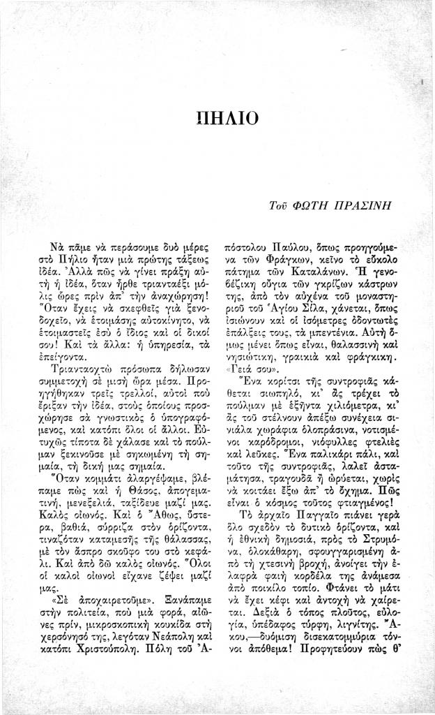 Πρασίνης Φώτης, «Πήλιο», Νέα Πορεία, τόμ. 12, τχ. 136 (Ιούνιος 1966), σ. 150-154