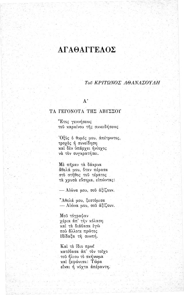 Αθανασούλης Κρίτων, «Αγαθάγγελος», Νέα Πορεία, τόμ. 12, τχ. 137-138 (Ιούλιος-Αύγουστος 1966), σ. 194-201