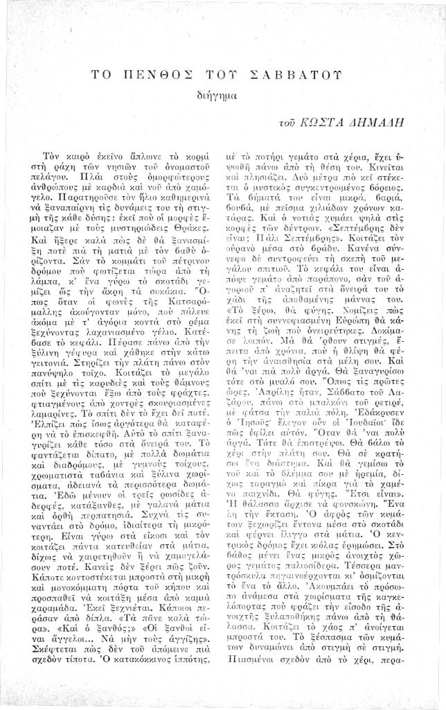 Δημάδης Κώστας, «Το πένθος του Σαββάτου», Νέα Πορεία, τόμ. 17, τχ. 195-196 (Μάιος-Ιούνιος 1971), σ. 61-64