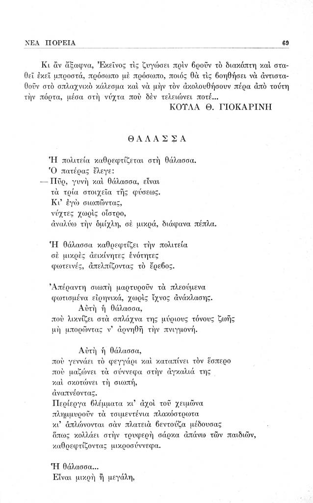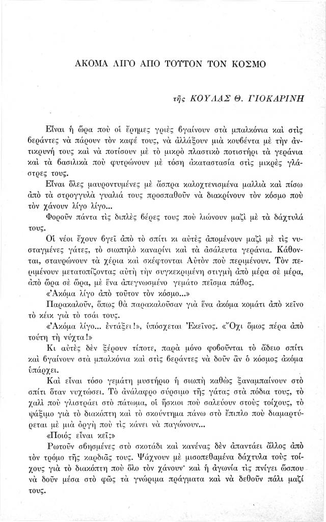Γιοκαρίνη Κούλα, «Ακόμα λίγο από τούτον τον κόσμο», Νέα Πορεία, τόμ. 17, τχ. 195-196 (Μάιος-Ιούνιος 1971), σ. 68-69