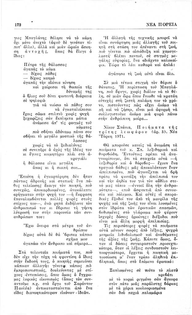 , «Νίκου Σπάνια, Ποιήματα της τρίτης λεωφόρου (αρ. 3)», Νέα Πορεία, τόμ. 18, τχ. 211-214 (Σεπτέμβριος-Δεκέμβριος 1972), σ. 172-173