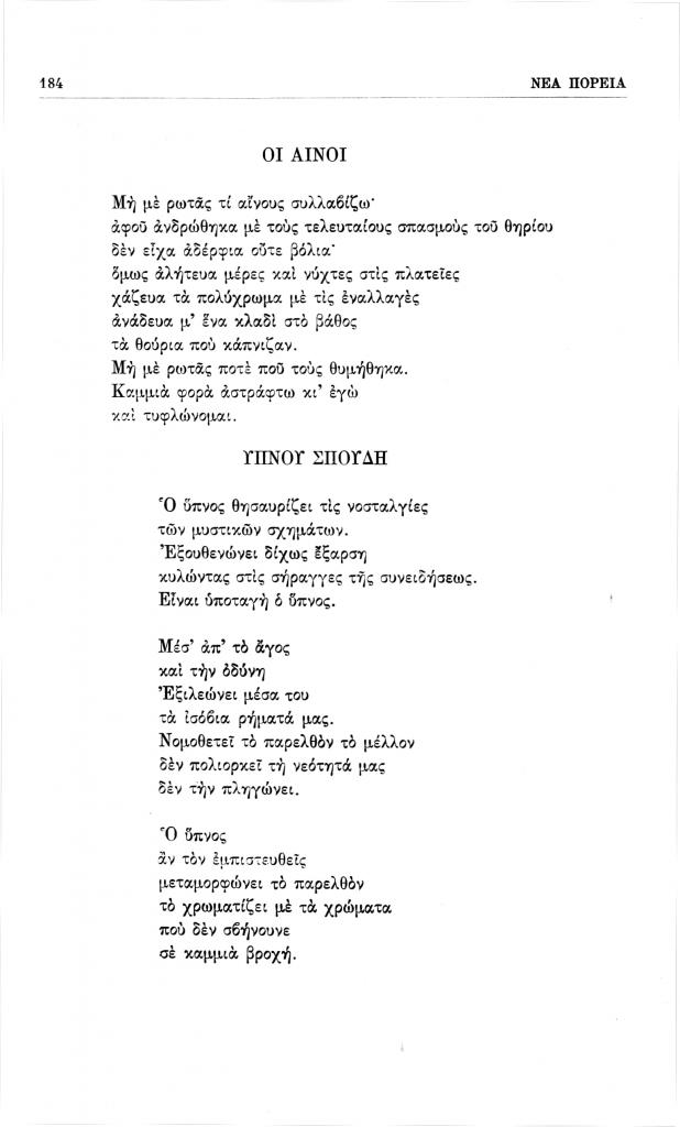 Βαρβέρης Γιάννης, «Ύπνου σπουδή», Νέα Πορεία, τόμ. 21, τχ. 247-250 (Σεπτέμβριος-Δεκέμβριος 1975), σ. 184