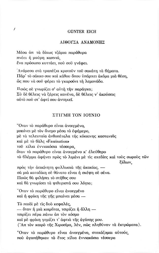 Eich Günther, «Στιγμή τον Ιούνιο», Νέα Πορεία, τόμ. 24, τχ. 275-279 (Ιανουάριος-Μάιος 1978), σ. 22-23