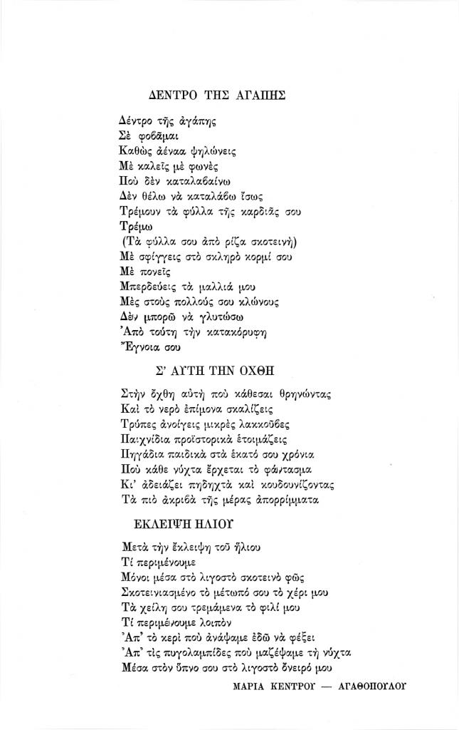 Κέντρου-Αγαθοπούλου Μαρία, «Δέντρο της αγάπης», Νέα Πορεία, τόμ. 24, τχ. 275-279 (Ιανουάριος-Μάιος 1978), σ. 25