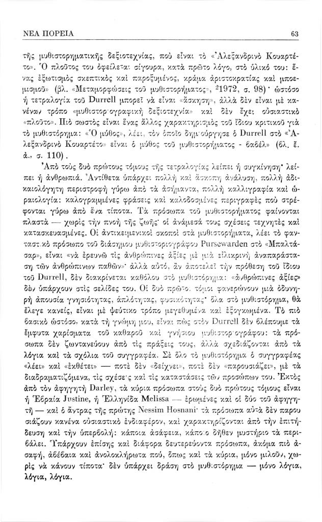 , «Lawrence Durrell, Justine, Baltazar (από τα Τετράδια κριτικής)», Νέα Πορεία, τόμ. 24, τχ. 280-283 (Ιούνιος-Σεπτέμβριος 1978), σ. 62-63