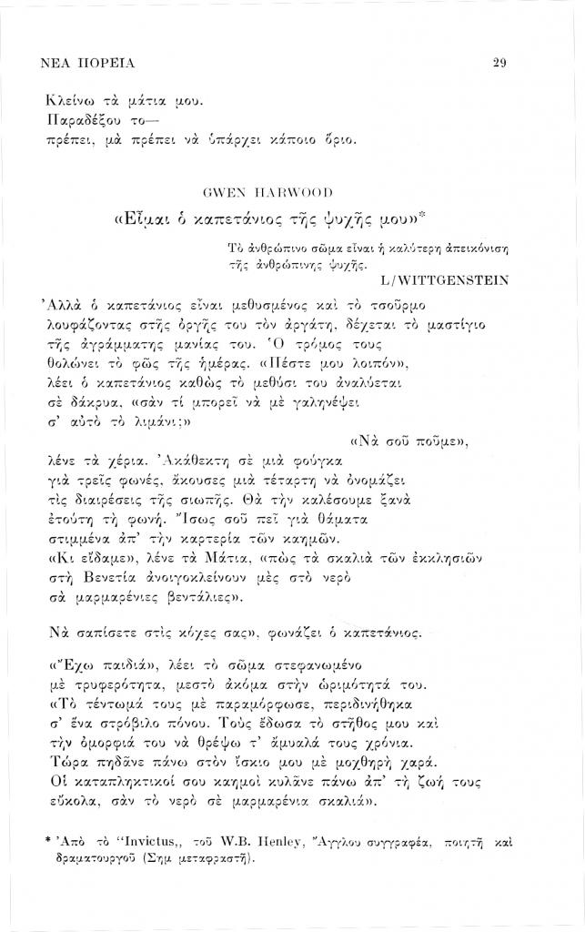 Harwood Gwen, «Είμαι ο καπετάνιος της ψυχής μου», Νέα Πορεία, τόμ. 29, τχ. 335-337 (Ιανουάριος-Μάρτιος 1983), σ. 29-30
