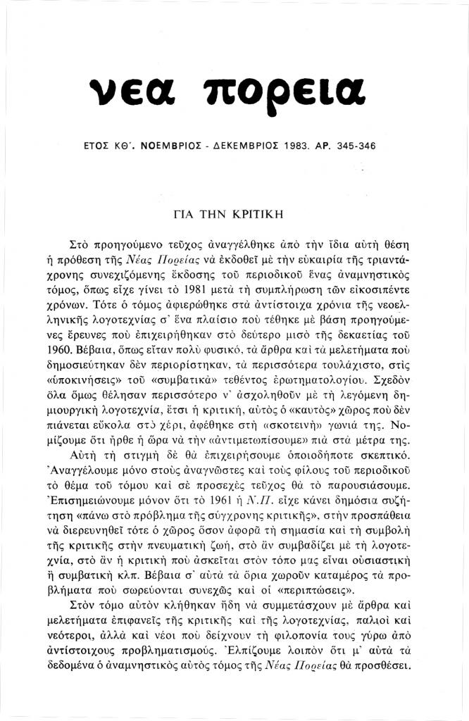 (ανυπόγραφο), «Για την κριτική», Νέα Πορεία, τόμ. 29, τχ. 345-346 (Νοέμβριος-Δεκέμβριος 1983), σ. 145