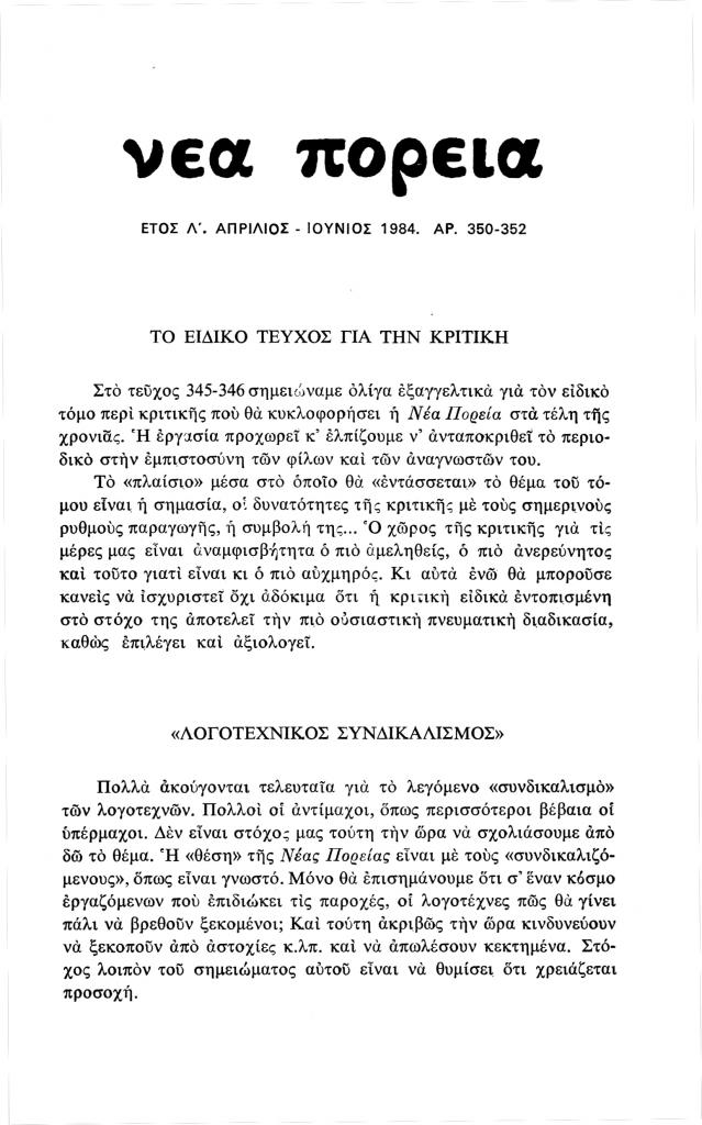 , «Το ειδικό τεύχος για την κριτική-Λογοτεχνικός συνδικαλισμός», Νέα Πορεία, τόμ. 30, τχ. 350-352 (Απρίλιος-Ιούνιος 1984), σ. 49