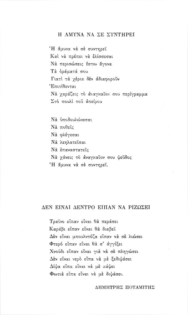 Ποταμίτης Δημήτρης, «Η άμυνα να σε συντηρεί», Νέα Πορεία, τόμ. 30, τχ. 357-358 (Νοέμβριος-Δεκέμβριος 1984), σ. 153