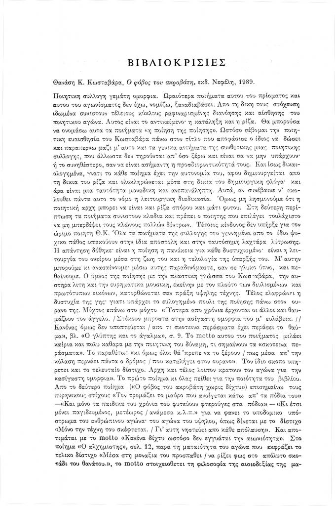 Ευστρατιάδης Αυρήλιος, «Θανάση Κωσταβάρα, Ο φόβος του ακροβάτη», Νέα Πορεία, τόμ. 35, τχ. 410-412 (Απρίλιος-Ιούνιος 1989), σ. 90-92