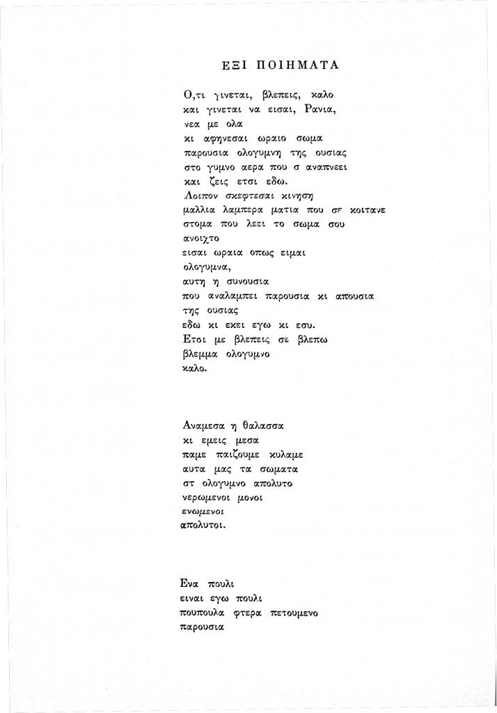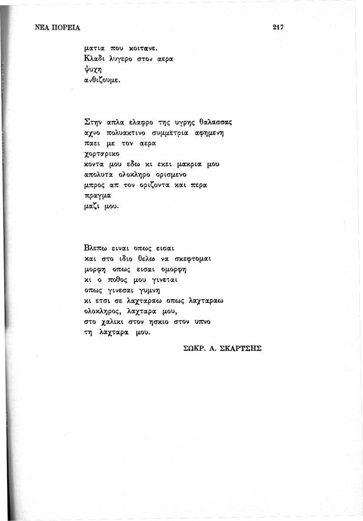 Σκαρτσής Σωκράτης Λ., «Έξι ποιήματα», Νέα Πορεία, τόμ. 39, τχ. 464-466 (Οκτώβριος-Δεκέμβριος 1993), σ. 216-217