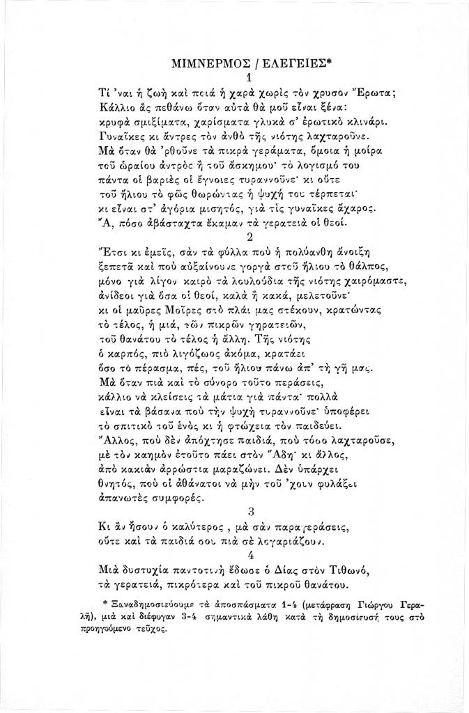 Μίμνερμος, «Ελεγείες», Νέα Πορεία, τόμ. 40, τχ. 467-470 (Ιανουάριος-Απρίλιος 1994), σ. 80