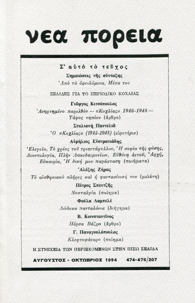 «#», Νέα Πορεία, τόμ. 40, τχ. 474-476 (Αύγουστος-Οκτώβριος 1994), σ. (εξώφυλλο)