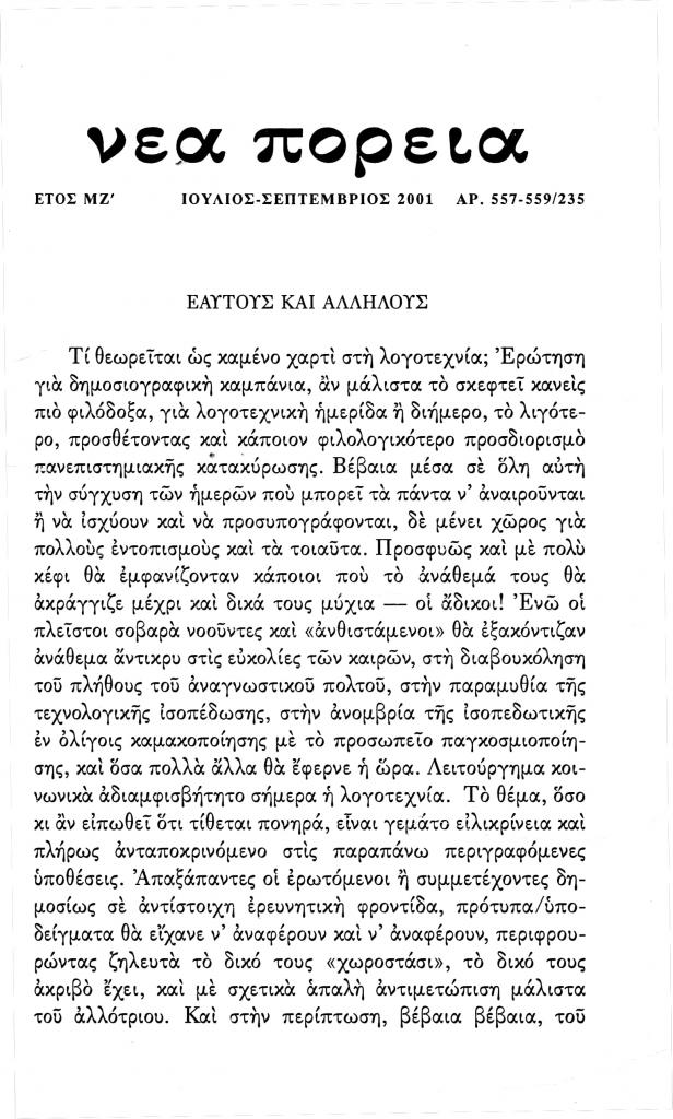 (ανυπόγραφο), «Εαυτούς και αλλήλους», Νέα Πορεία, τόμ. 47, τχ. 557-559 (Ιούλιος-Σεπτέμβριος 2001), σ. 161-162