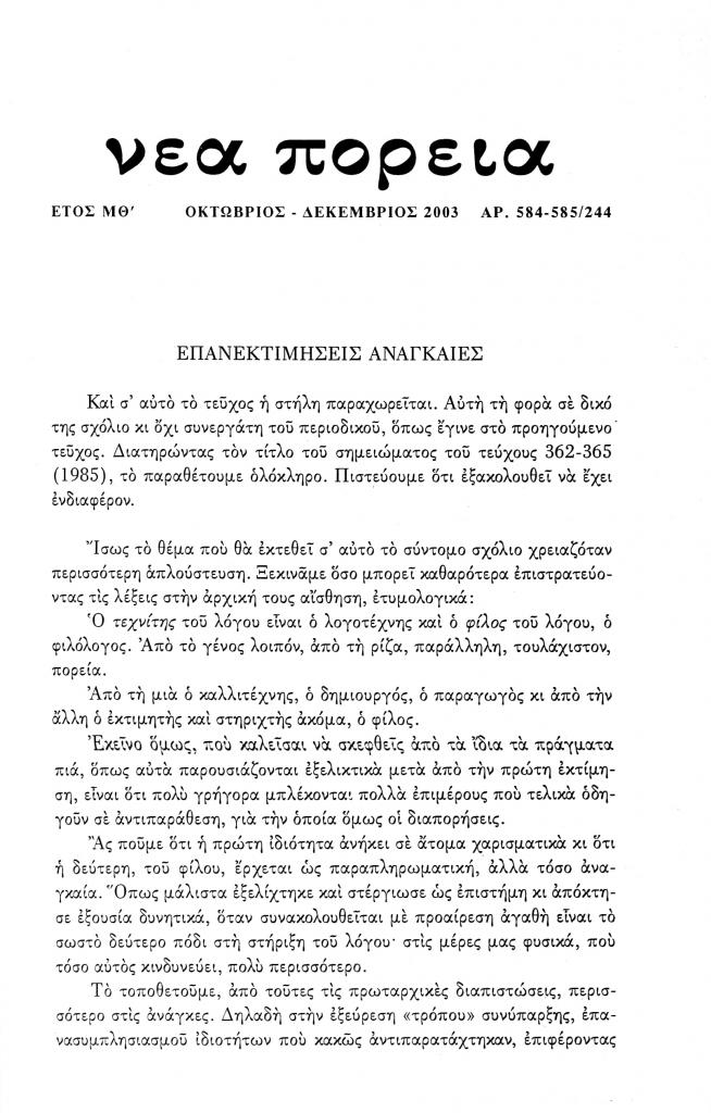 (ανυπόγραφο), «Επανεκτιμήσεις αναγκαίες», Νέα Πορεία, τόμ. 49, τχ. 584-586 (Οκτώβριος-Δεκέμβριος 2003), σ. 241-242