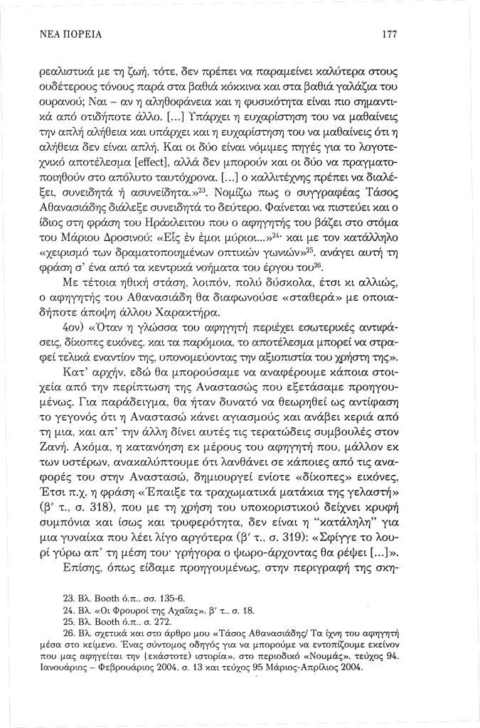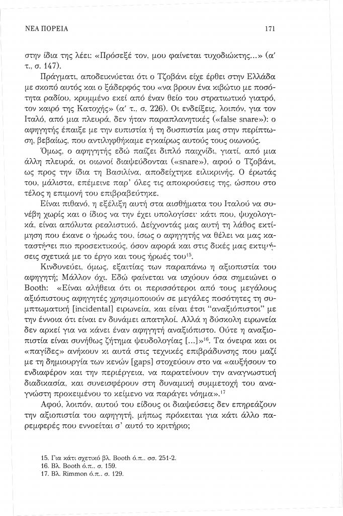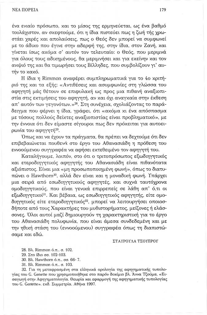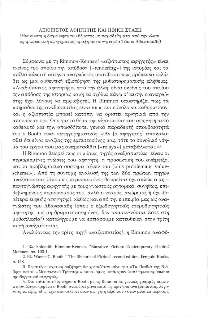 Τσούπρου Σταυρούλα, «Αξιόπιστος αφηγητής και ηθική στάση», Νέα Πορεία, τόμ. 50, τχ. 590-592 (Απρίλιος-Ιούνιος 2004), σ. 167-179
