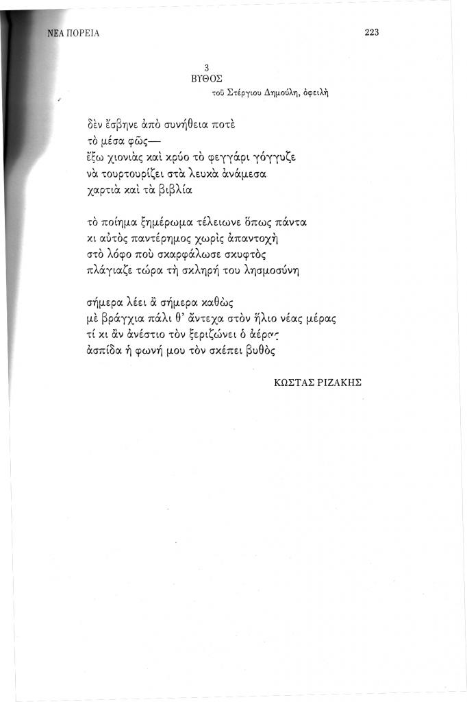 , «Τρία ποιήματα δοσμένα-κατά την έκφραση του Γιώργου Σεφέρη: 3. Βυθός», Νέα Πορεία, τόμ. 50, τχ. 593-595 (Ιούλιος-Σεπτέμβριος 2004), σ. 223
