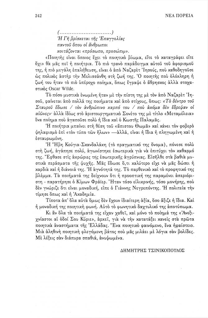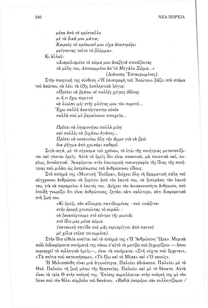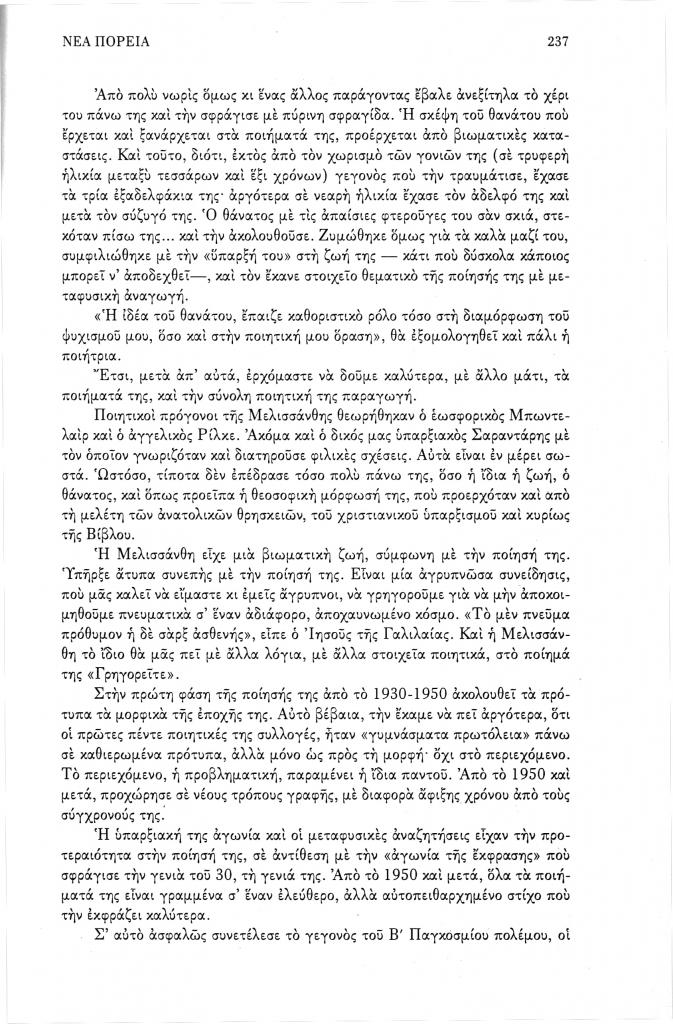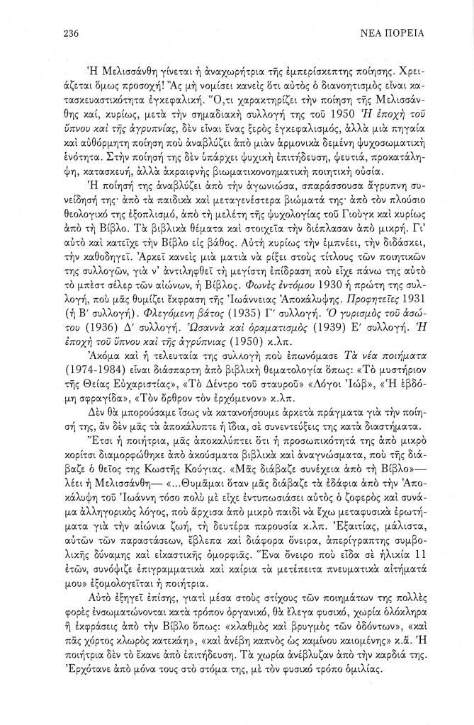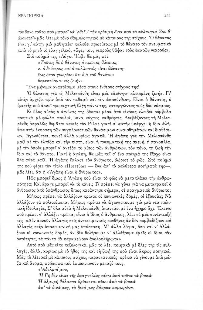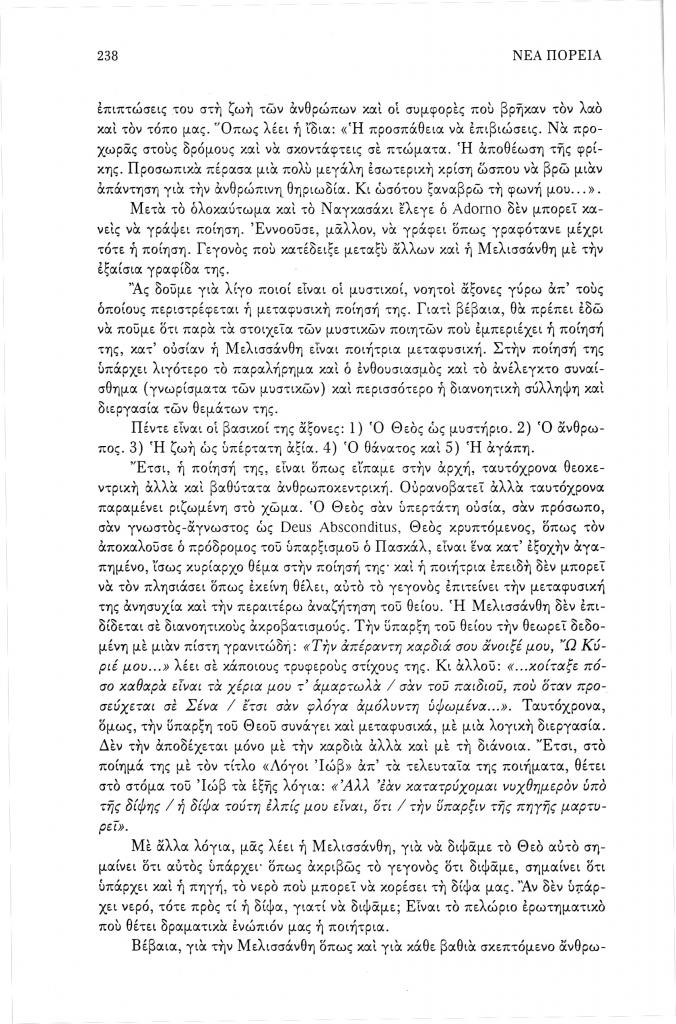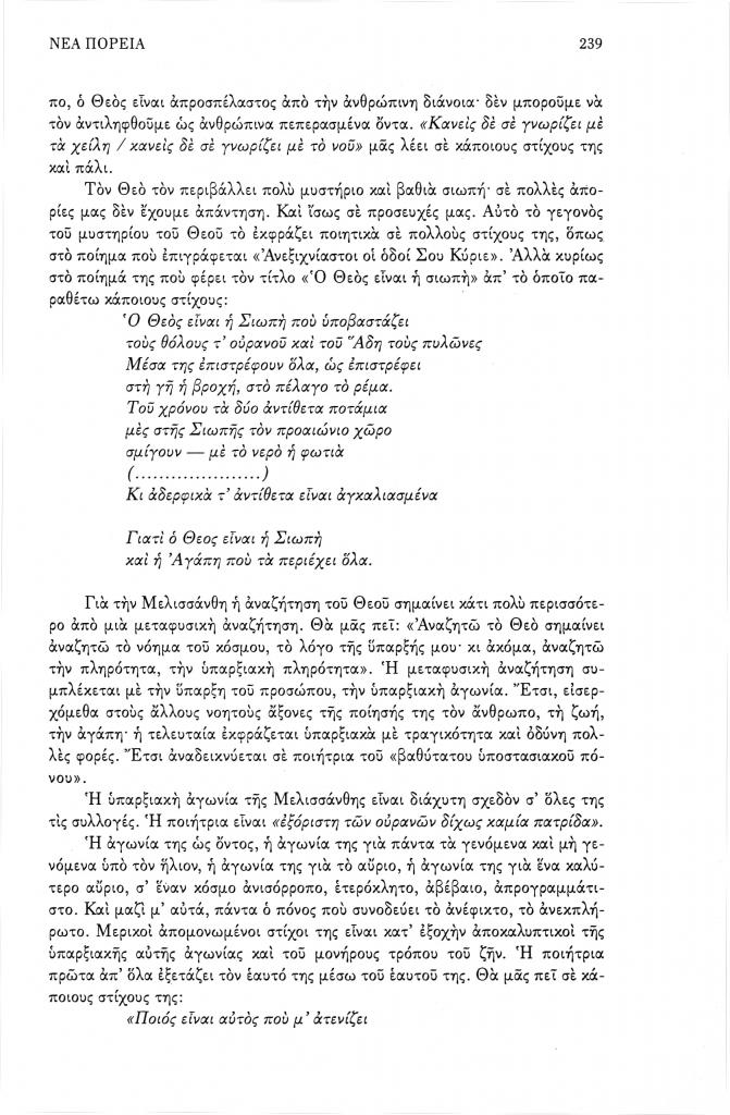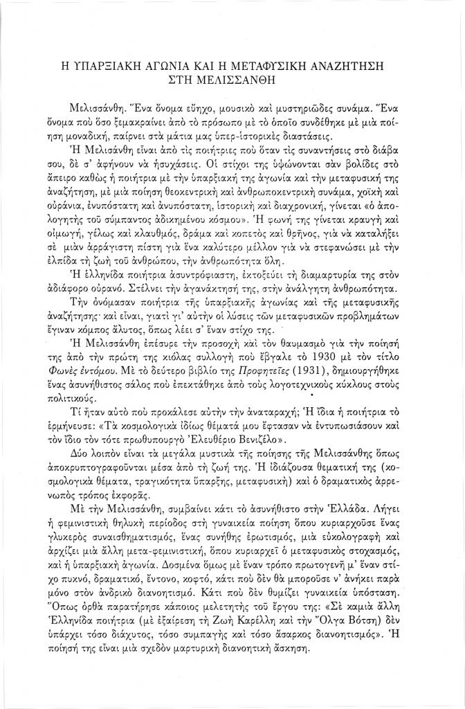 , «Η υπαρξιακή αγωνία και η μεταφυσική αναζήτηση στη Μελισσάνθη», Νέα Πορεία, τόμ. 50, τχ. 593-595 (Ιούλιος-Σεπτέμβριος 2004), σ. 235-242