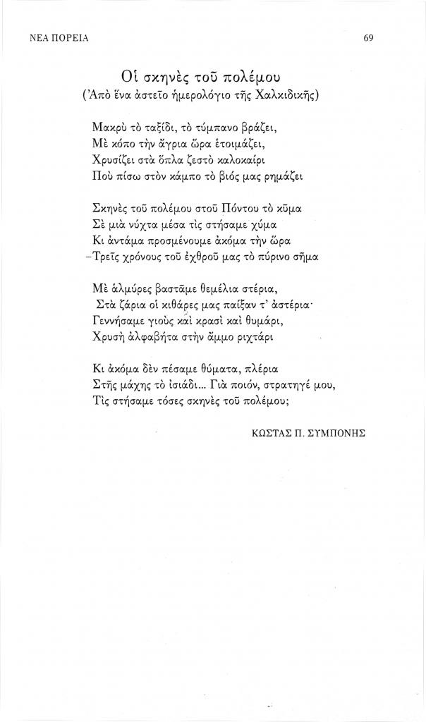 Συμπόνης Κώστας Π., «Οι σκηνές του πολέμου (Από ένα αστείο ημερολόγιο της Χαλκιδικής)», Νέα Πορεία, τόμ. 51, τχ. 599-601 (Ιανουάριος-Μάρτιος 2005), σ. 69