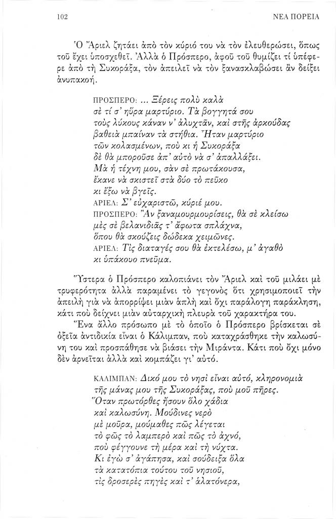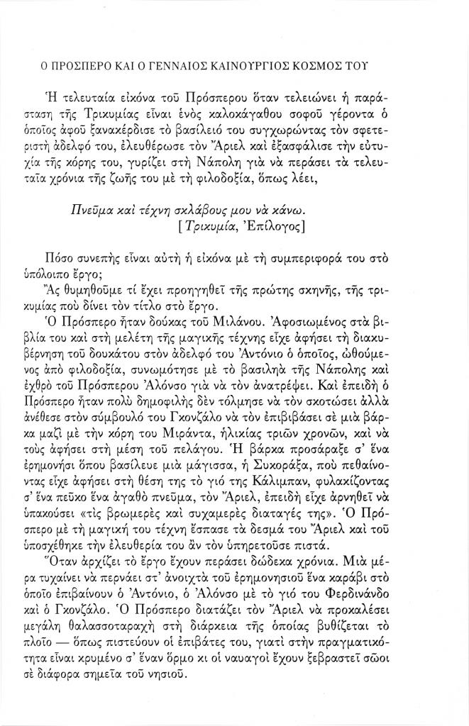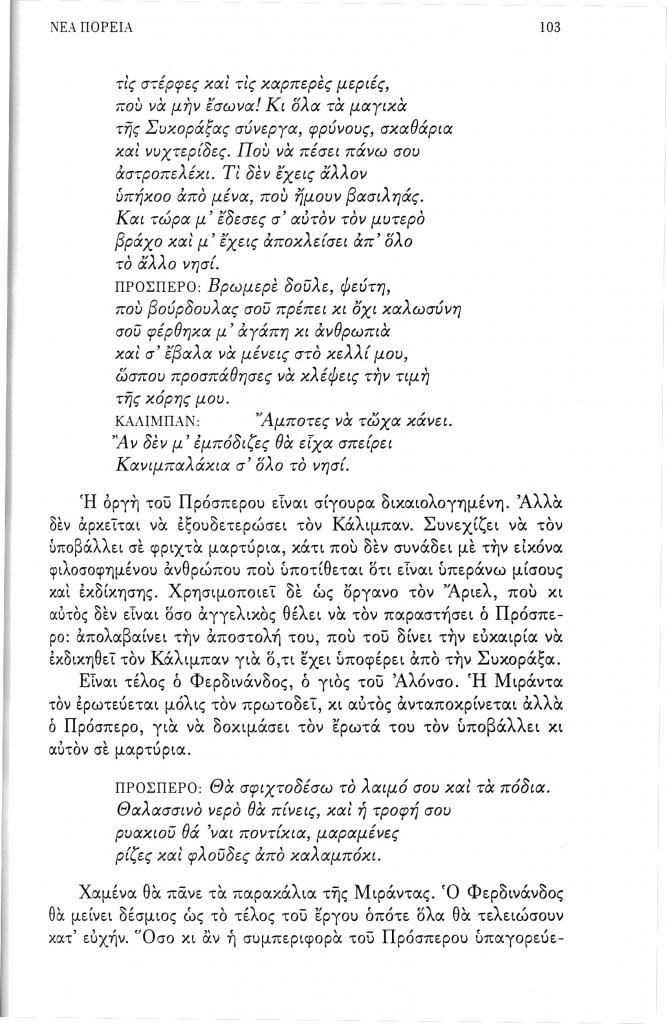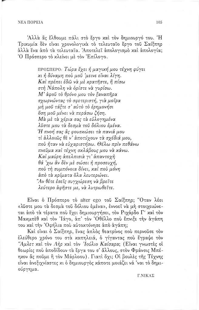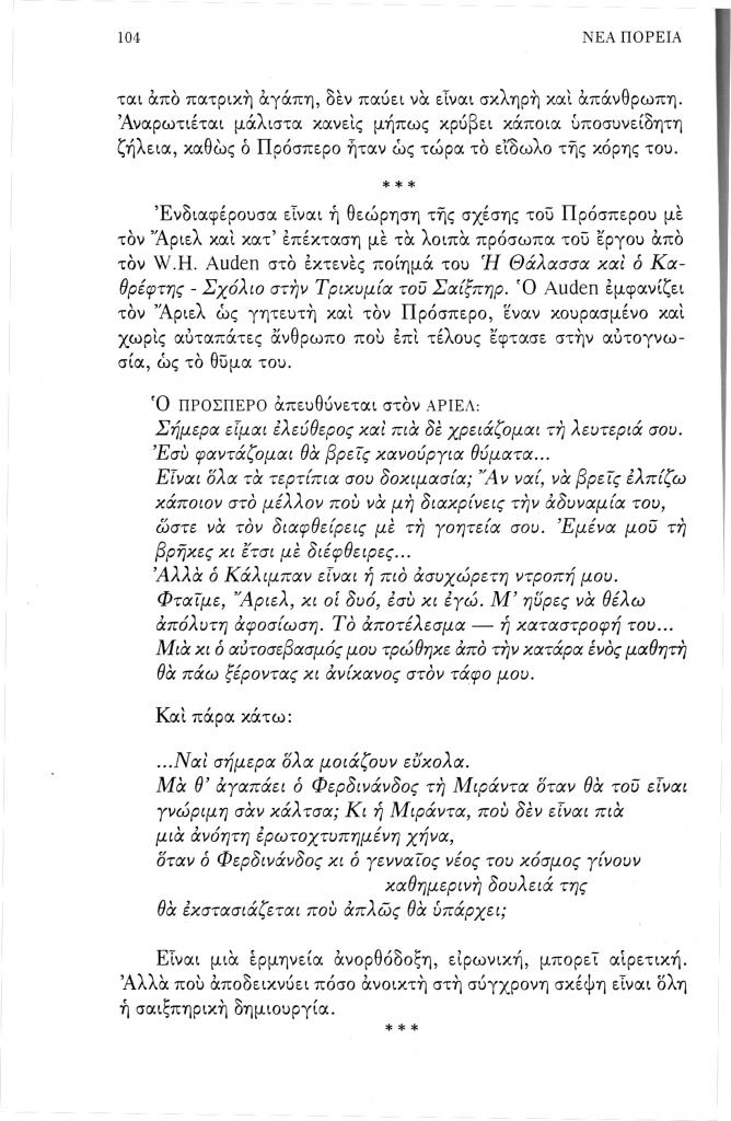 , «Ο Πρόσπερο και ο γενναίος καινούργιος κόσμος του», Νέα Πορεία, τόμ. 51, τχ. 602-604 (Απρίλιος-Ιούνιος 2005), σ. 101-105