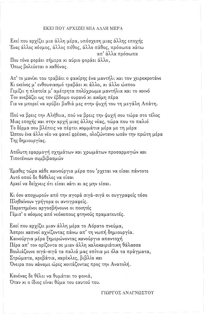 Αναγνώστου Γιώργος, «Εκεί που αρχίζει μια άλλη μέρα», Νέα Πορεία, τόμ. 51, τχ. 602-604 (Απρίλιος-Ιούνιος 2005), σ. 111