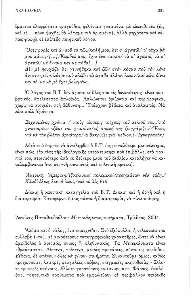 Παρασχάς Κ., «Αντώνης Παπαθεοδούλου, Μετεικάσματα, ποιήματα», Νέα Πορεία, τόμ. 51, τχ. 605-607 (Ιούλιος-Σεπτέμβριος 2005), σ. 231-232