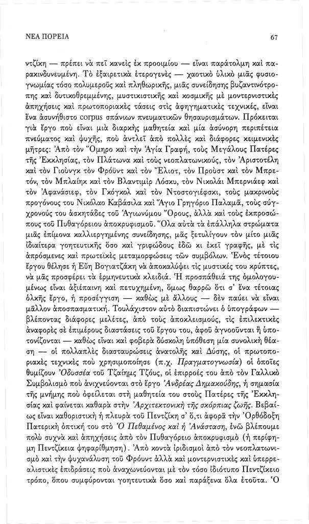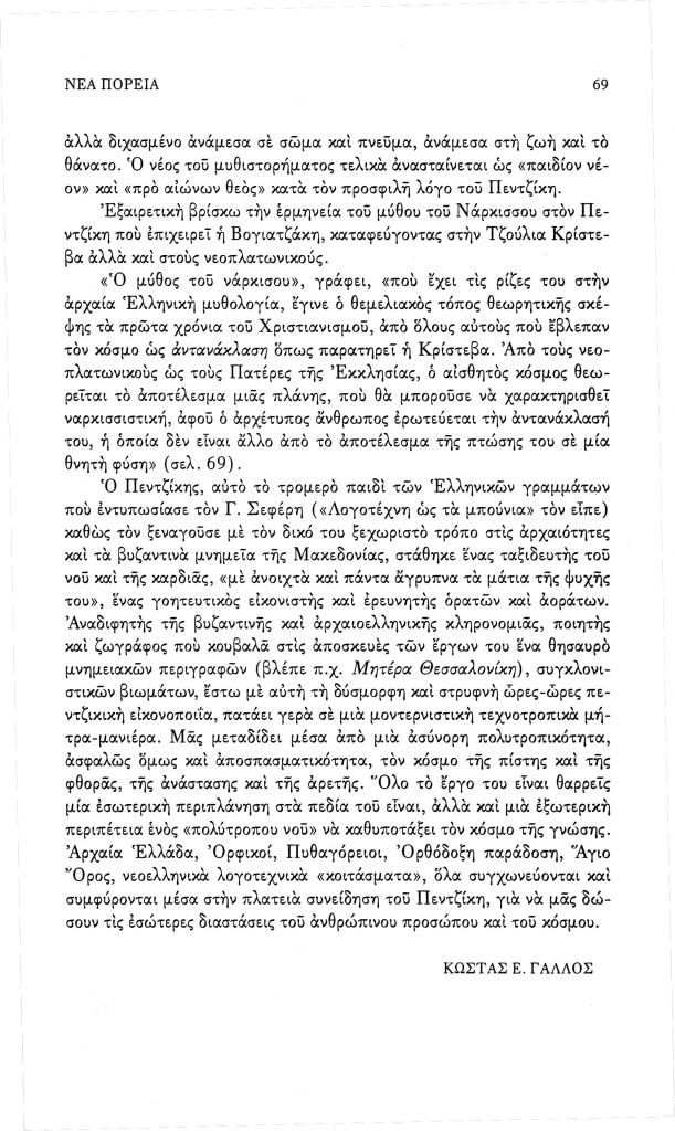 Γάλλος Κώστας Ε., «Εύης Βογιατζάκη, Νίκος Γαβριήλ Πεντζίκης, Ο άνθρωπος και τα σύμβολα», Νέα Πορεία, τόμ. 52, τχ. 611-613 (Ιανουάριος-Μάρτιος 2005), σ. 66-69