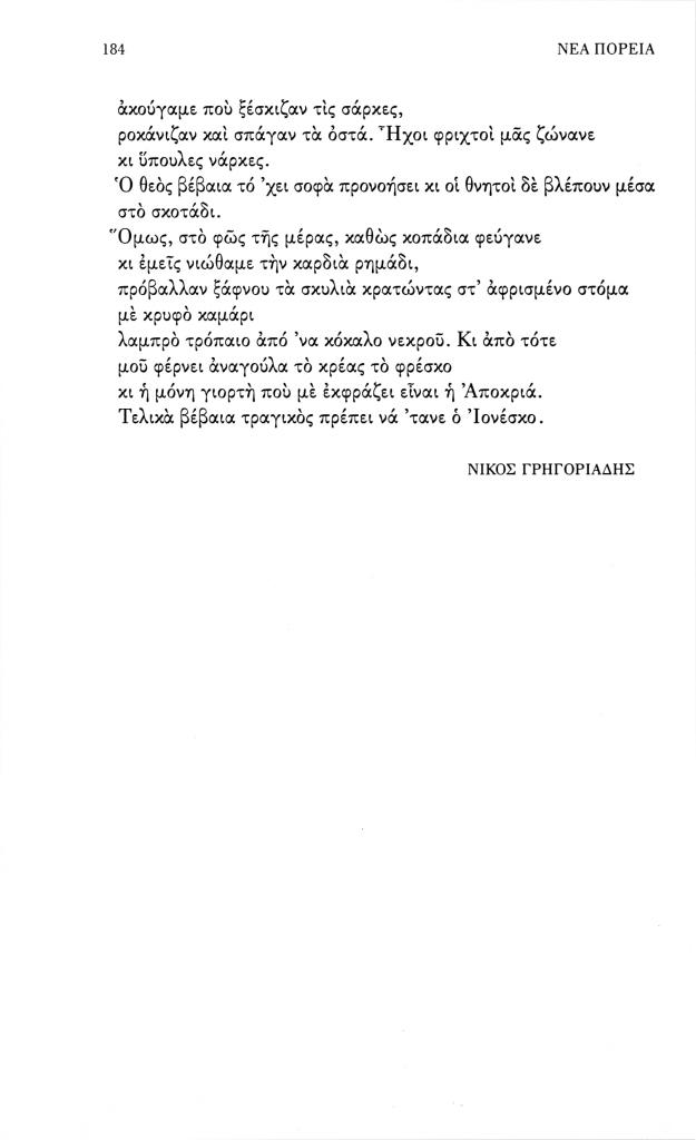 Γρηγοριάδης Νίκος, «Η μόνη γιορτή», Νέα Πορεία, τόμ. 52, τχ. 617-619 (Ιούλιος-Σεπτέμβριος 2006), σ. 183-184