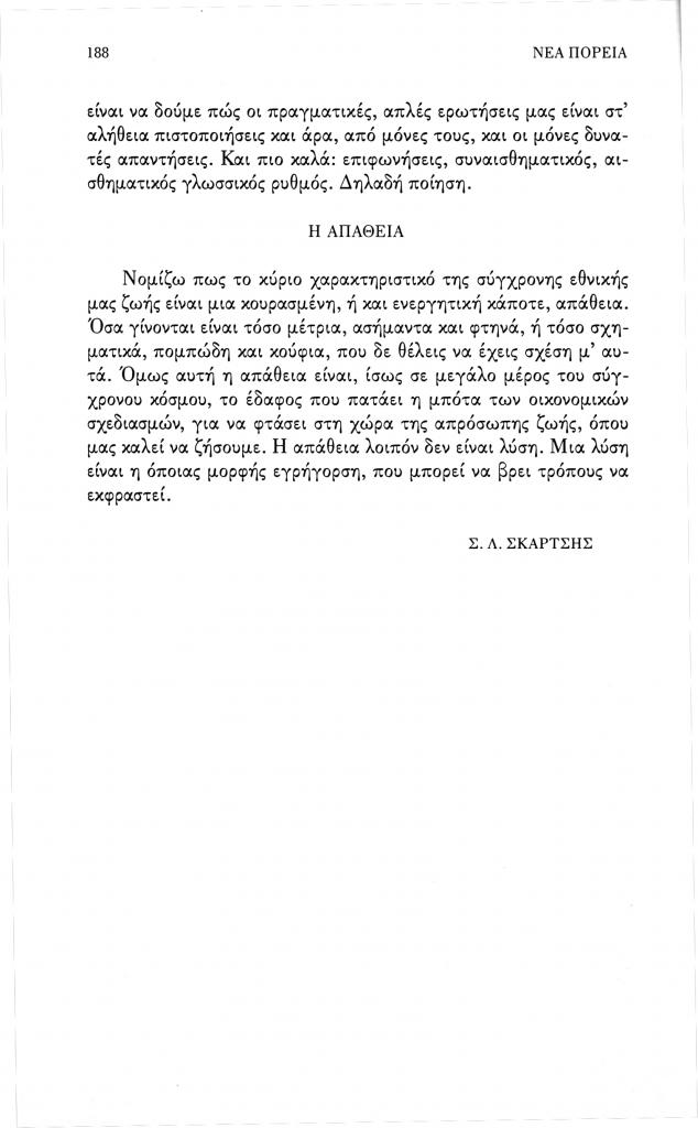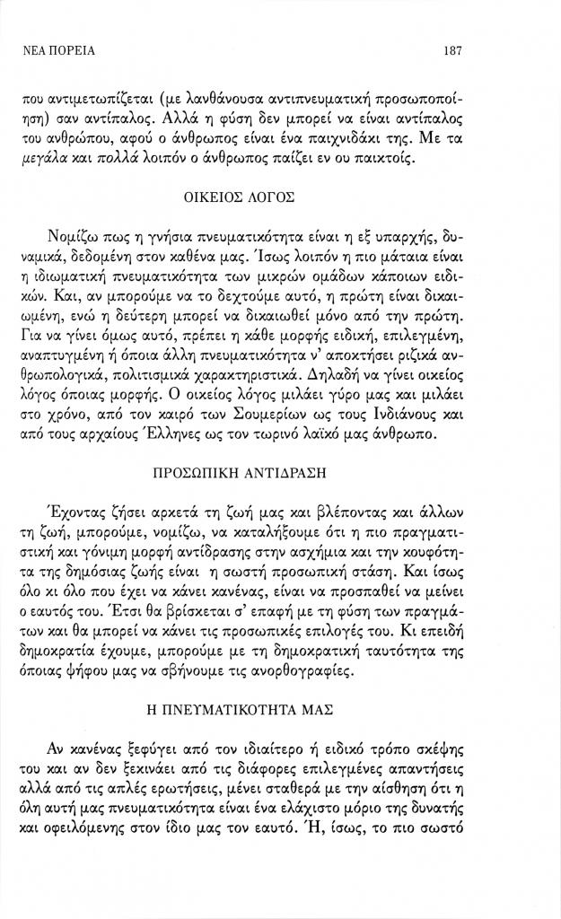 Σκαρτσής Σωκράτης Λ., «Η πνευματικότητά μας», Νέα Πορεία, τόμ. 52, τχ. 617-619 (Ιούλιος-Σεπτέμβριος 2006), σ. 187-188