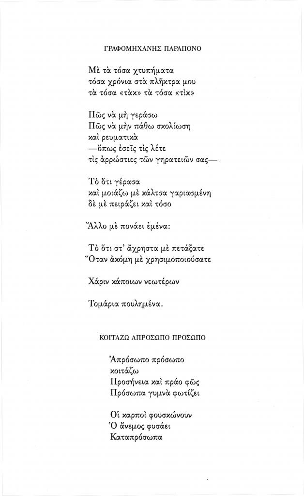 Τσινικόπουλος Δημήτρης, «Γραφομηχανής παράπονο», Νέα Πορεία, τόμ. 52, τχ. 617-619 (Ιούλιος-Σεπτέμβριος 2006), σ. 216