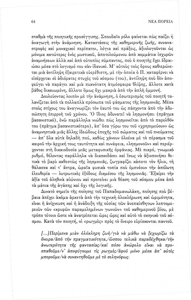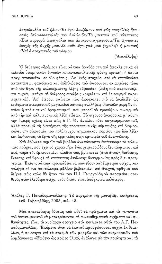 Παρασχάς Κ., «Ακύλας Γ. Παπαδομανωλάκης, Το πορτρέτο της μοναξιάς, ποιήματα», Νέα Πορεία, τόμ. 53, τχ. 623-625 (Ιανουάριος-Μάρτιος 2007), σ. 63-64
